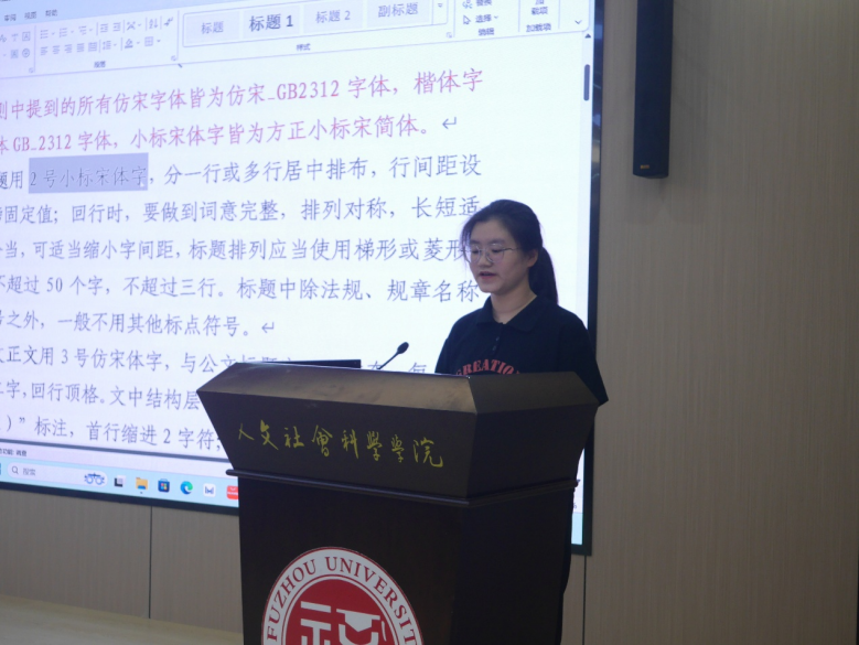 学生会主席团成员严婉蓉就基础办公技能的技巧与实操开展培训。她详细介绍了公文写作与表格制作的格式规范,重点讲解了文档排版、字体字号、标题结构、附件处理等内容,帮助各部门成员快速了解和掌握杏吧原创
